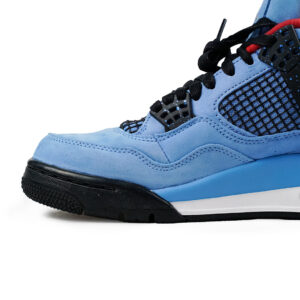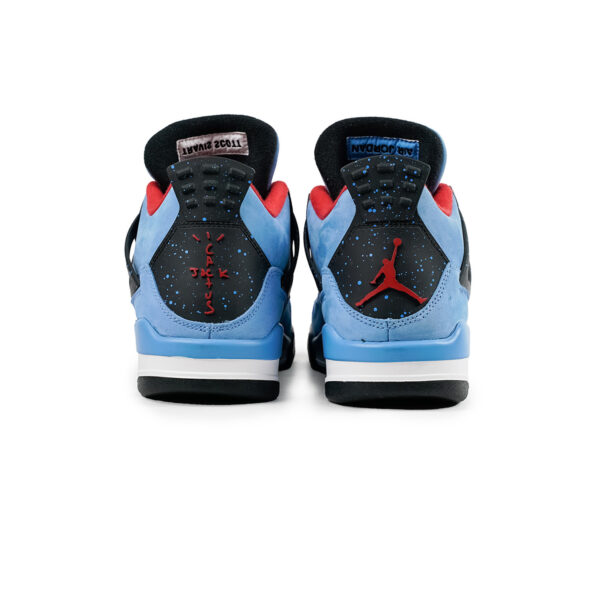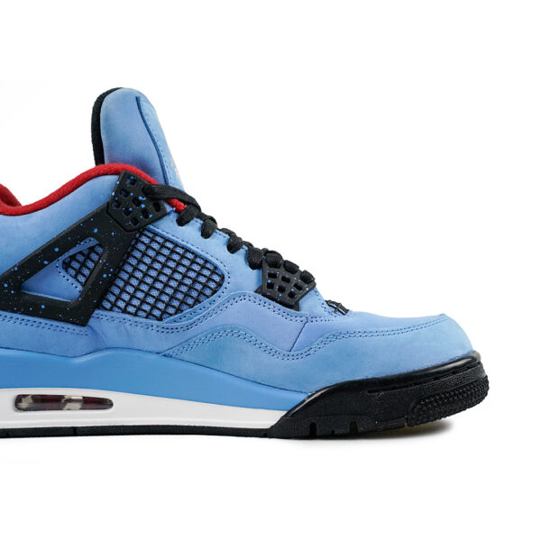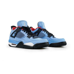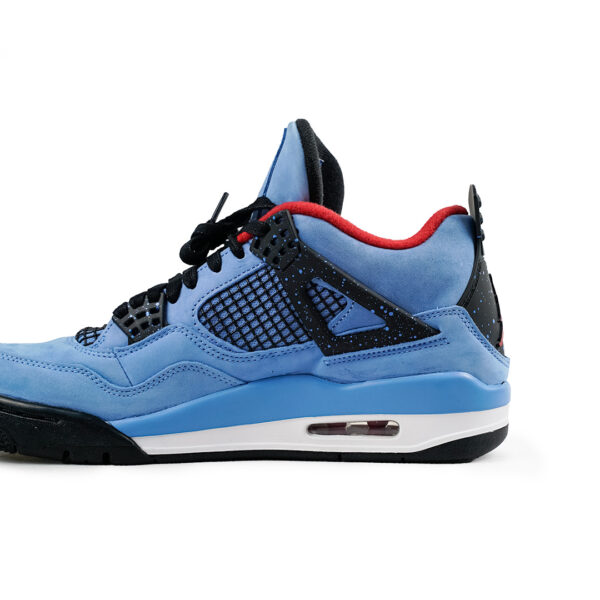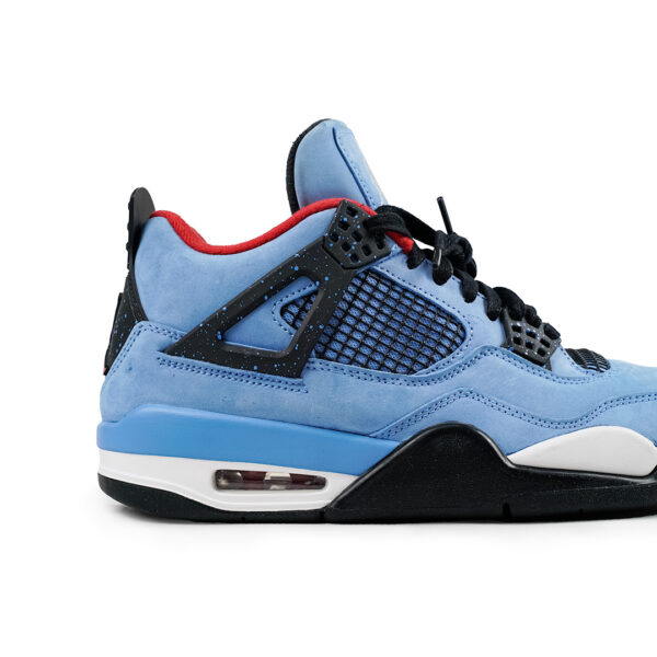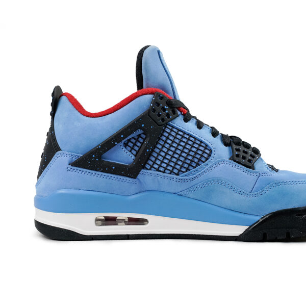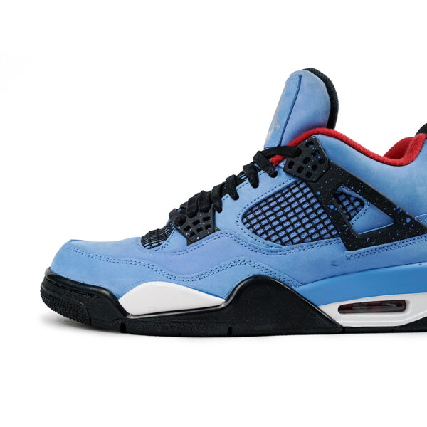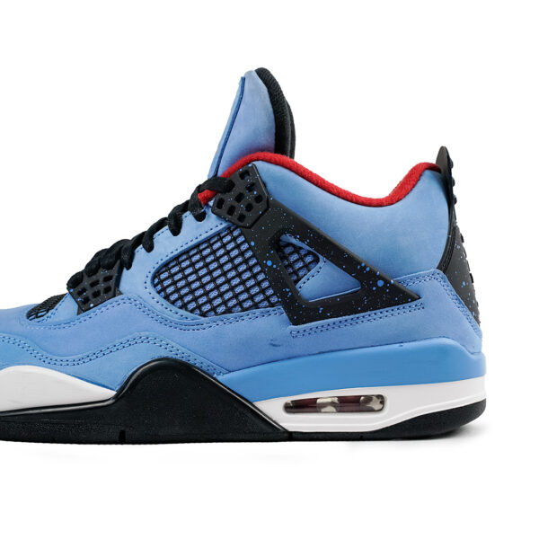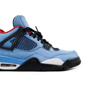 Model Air Jordan 4 Retro Travis Scott Cactus Jack (kod: 308497-406) wyróżnia się wyjątkową paletą barw. Dominującym kolorem jest błękitna skóra nubukowa, przełamana czarnymi i czerwonymi akcentami, które nadają butom unikalnego charakteru. Na pięcie umieszczono kontrastujące logotypy – klasyczne Nike Air i specjalne „Cactus Jack”, co podkreśla kolekcjonerski status tego wydania.