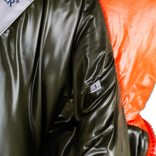 Kurtka jest w idealnym stanie – nie nosi żadnych większych wad, materiał zachował połysk, a puch pełną sprężystość.